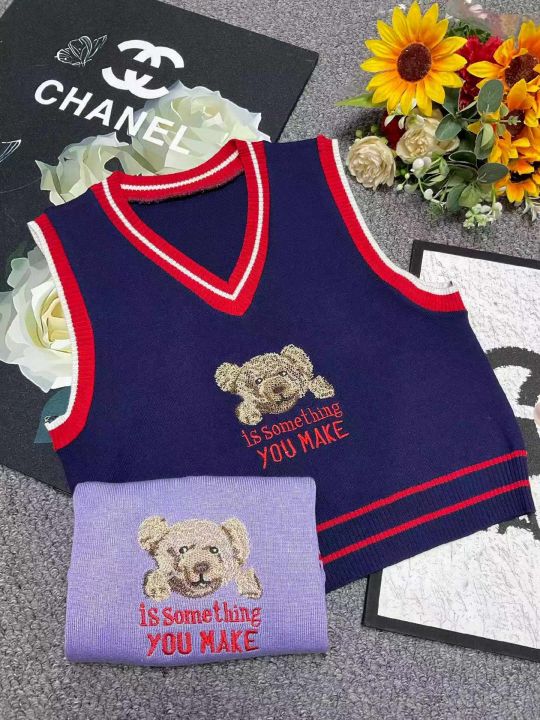 春季新款韩版学院风卡通小熊提花V领套头毛衣马甲,独...