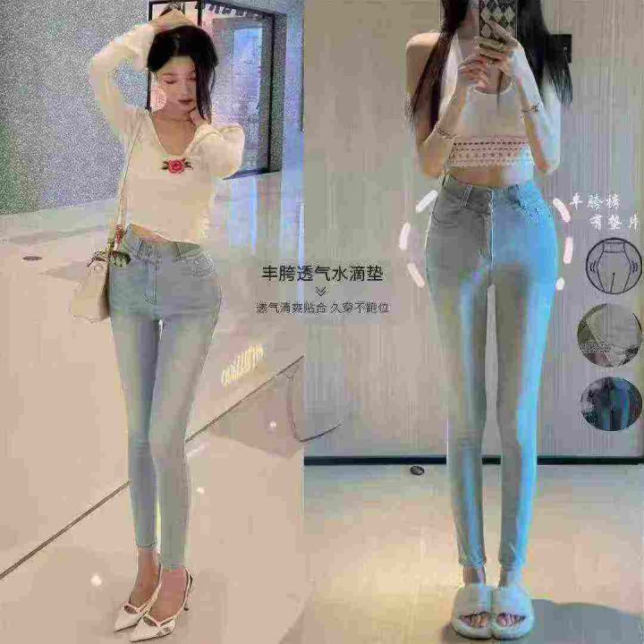 ☕️高弹力韩版辣妹高腰丰胯双扣弹力包臀牛仔长裤女显...