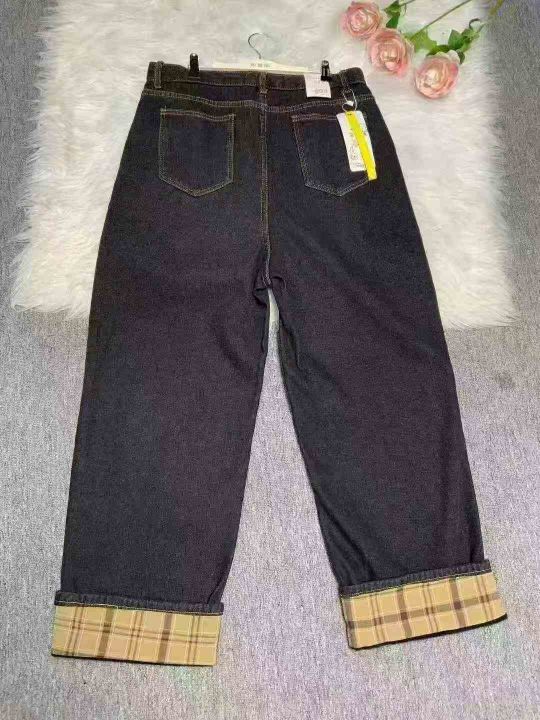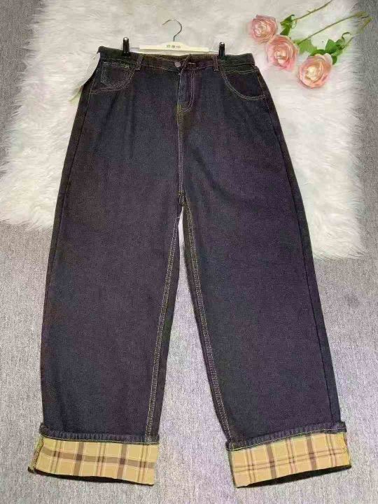 秋冬复古加绒加厚宽松显瘦牛仔裤女大码胖mm高腰直筒翻边阔腿长裤180件,独立包装带吊牌,尺码S~5XL全清福利价8.8元