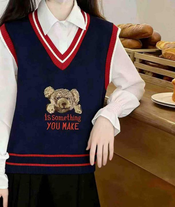 春季新款韩版学院风卡通小熊提花V领套头毛衣马甲,独...