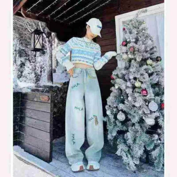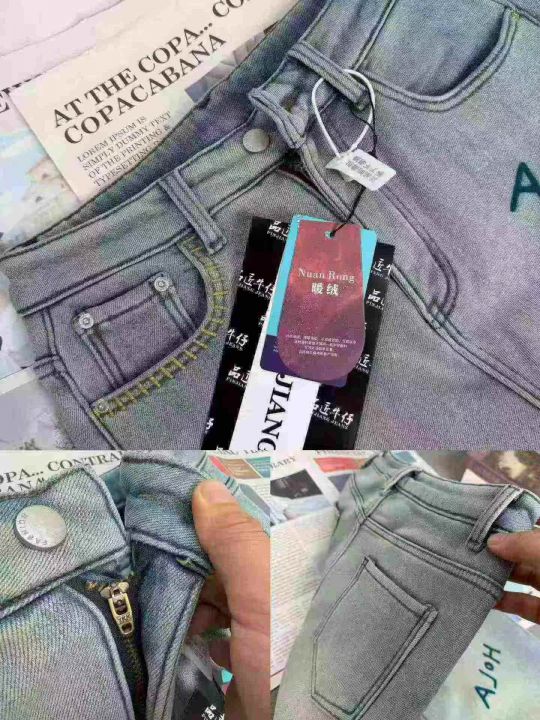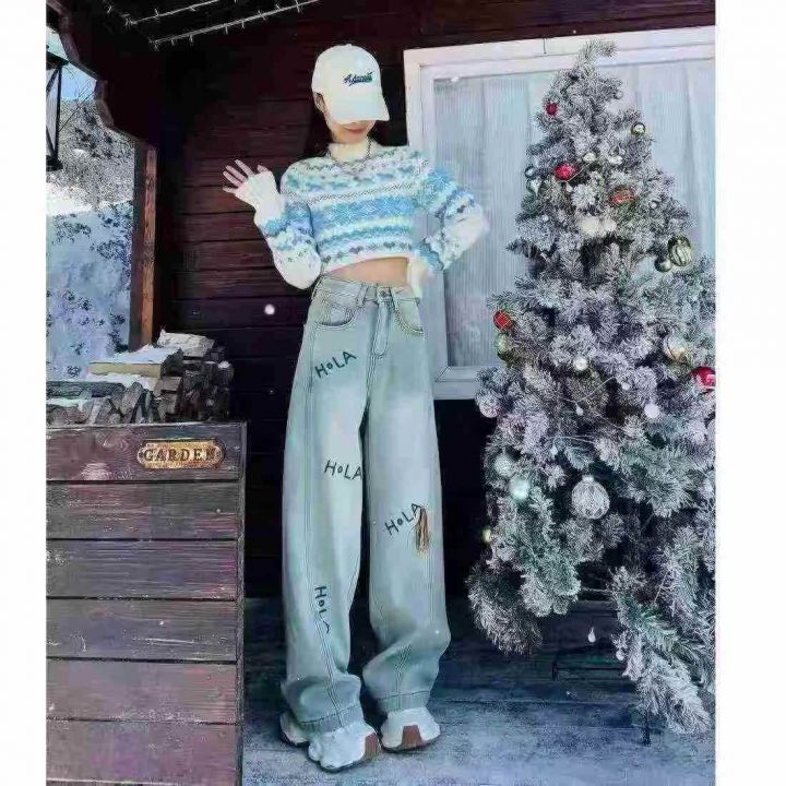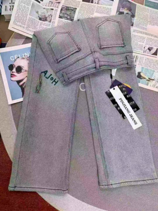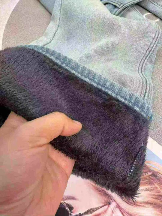 浅色刺绣秋冬款加厚绒款弹力阔腿牛仔裤,单款单色,独...