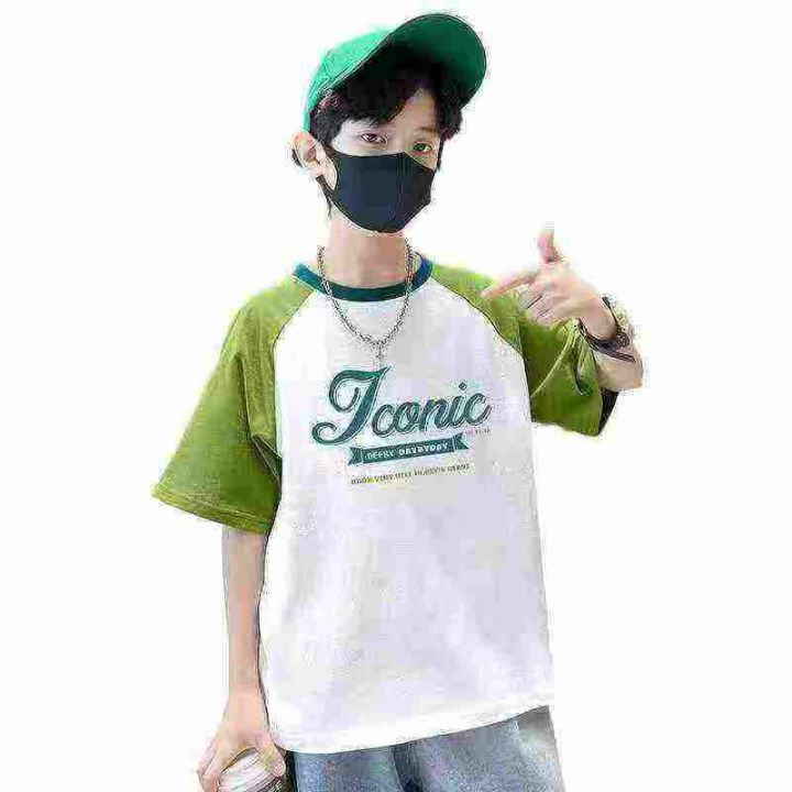纯棉英文字母印花拼袖童装T恤 数量500件左右 尺码110--160 整款单色 后领包边 独立包装带吊牌 模特图供参考
