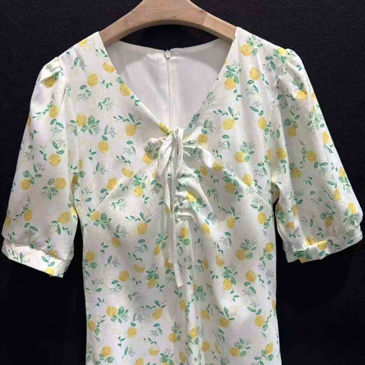 女装连衣裙整垮辣妹装大童装清新黄绿碎花前胸绑带背后...