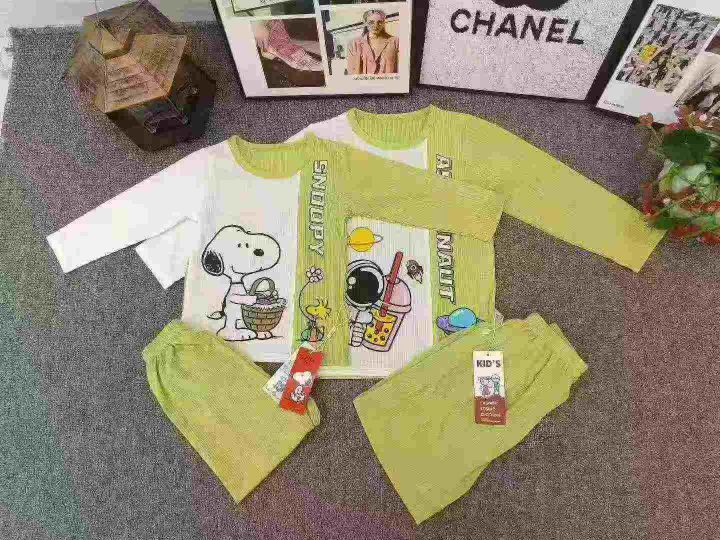 品牌童装长袖家居服套装,数量500套左右,尺码90--150,大码多,整款单色两个品牌(史努比、baby),独立包装带吊牌,货品整洁质佳