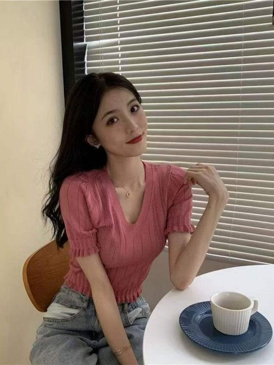 夏季新款镂韩版V领木耳边冰丝设计感高腰显瘦短款针织T...