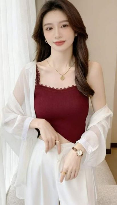 夏季新款纯欲奶甜法式别致甜辣蕾丝拼接针织吊带背心,...
