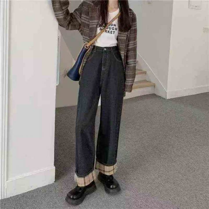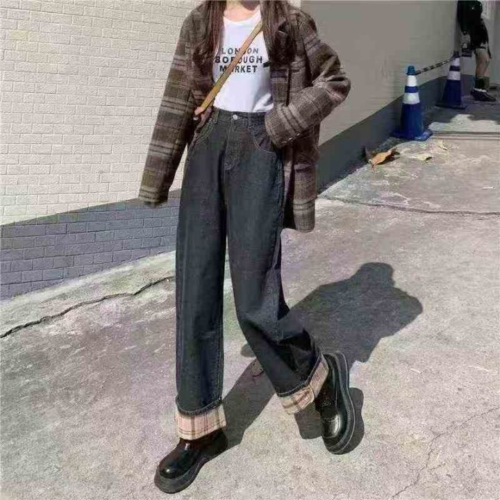 秋冬复古加绒加厚宽松显瘦牛仔裤女大码胖mm高腰直筒翻边阔腿长裤180件,独立包装带吊牌,尺码S~5XL全清福利价8.8元