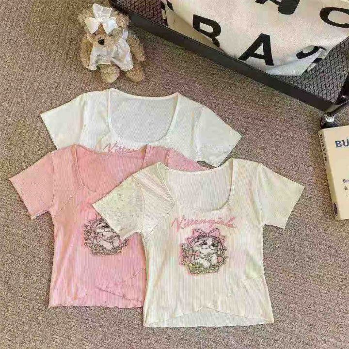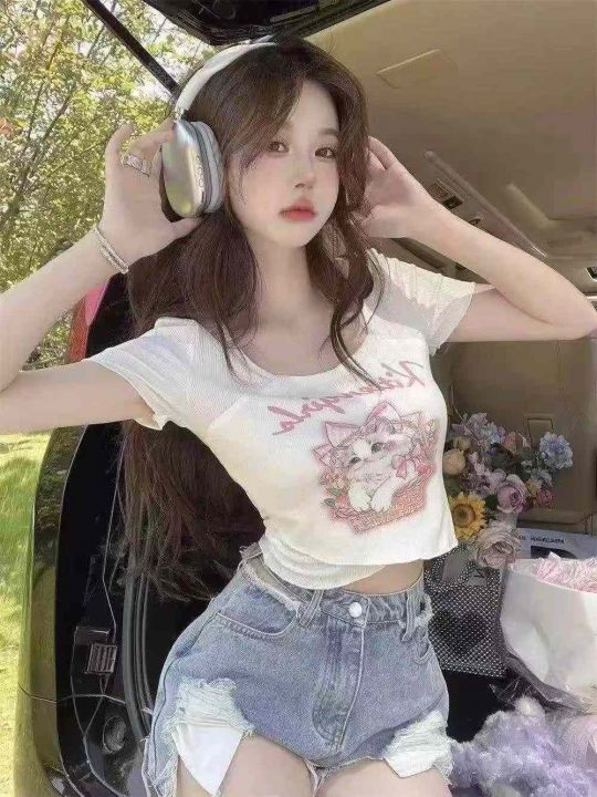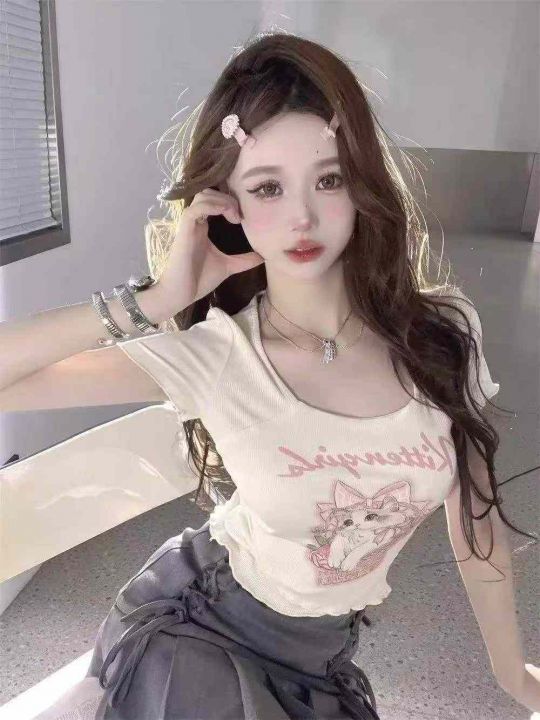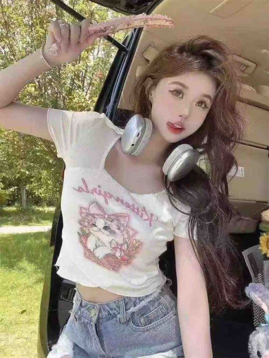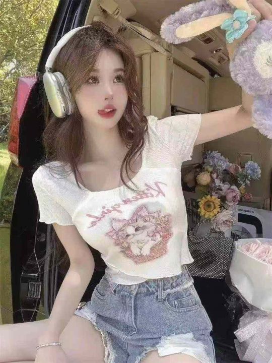 [烟花][烟花]夏纯欲甜辣妹性感短款上衣整款303件,卡通可爱猫咪正肩短袖t恤女设计感小众,独立包装,粉色较多,分货➕1