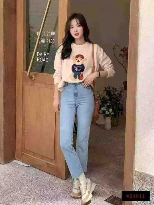 高弹力流苏睫毛边~直筒牛仔裤女春夏高腰超显瘦烟管裤...