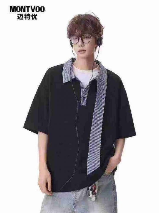 「航海系」迈特优领口拼接短袖男女同款夏季设计感宽松休闲情侣T恤 数量80件左右 尺码S--L 两个颜色 独立包装 货品干净整洁