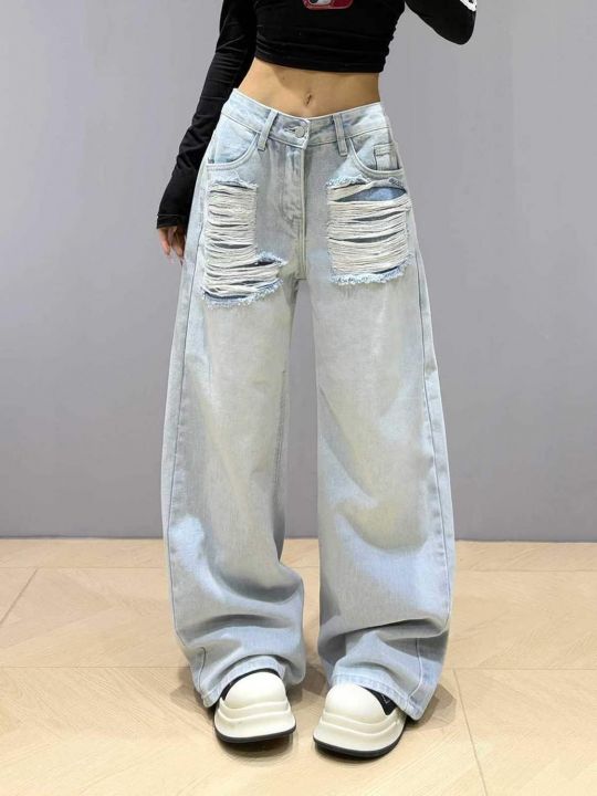 春季新款网红复古水洗磨破美式直筒阔腿牛仔裤,独立包装带腰卡带防伪扣,码...