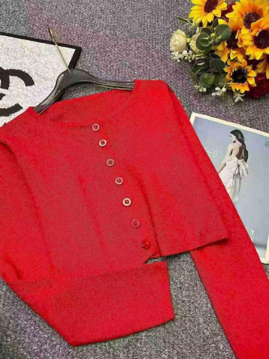 春季新款网红复古红色净版简约长袖针织开衫,独立包装...