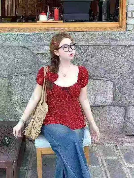[月亮]:波点蕾丝花边蝴蝶结温柔风辣妹上衣