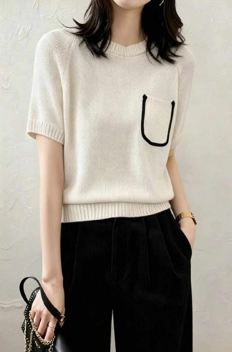 夏季新款韩系亚麻透气肌理薄款圆领口袋设计款冰丝针织...