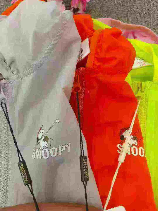 史努比品牌男女童装印花连帽防晒衣,数量10000件左右,尺码110--160,统一品牌,五个色带口袋,独立拉链包装带吊牌,货品干净整洁