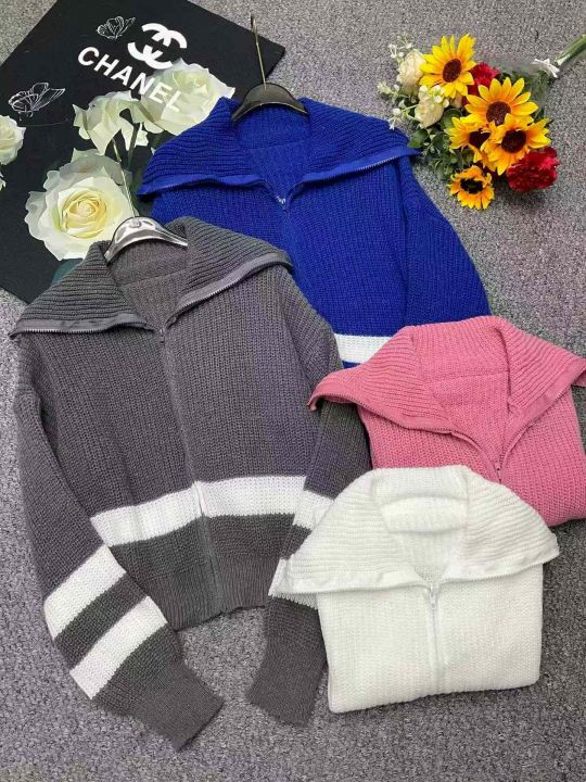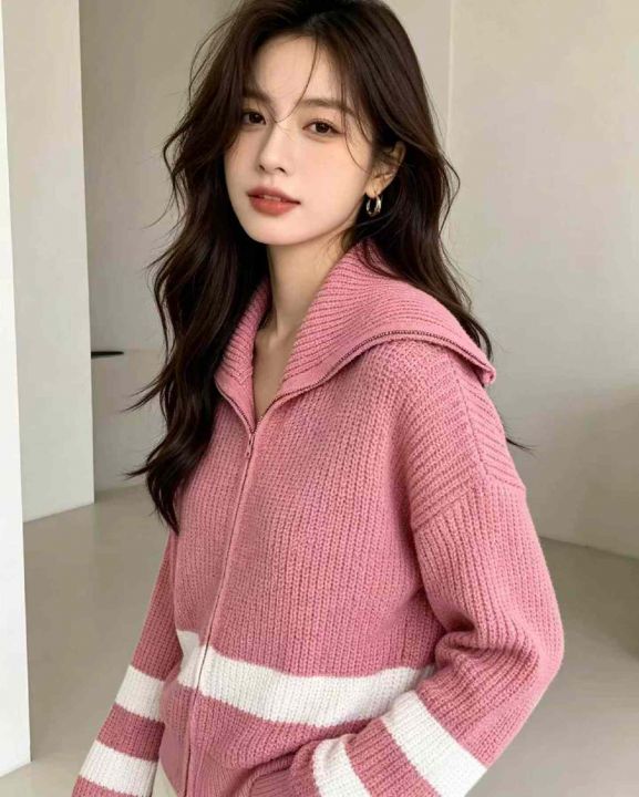 秋冬新款洋气韩版设计感拉链翻领毛衣开衫,独立包装,...