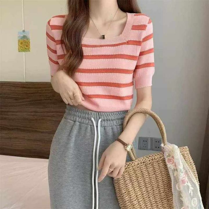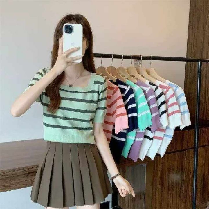 夏季新款撞色条纹韩系针织短袖T桖,独立包装,均码面料柔软舒适弹力大,单款多色,258件,全清5.9元超低价秒杀!分货加一!