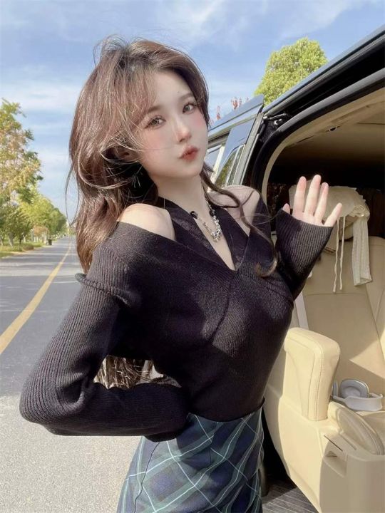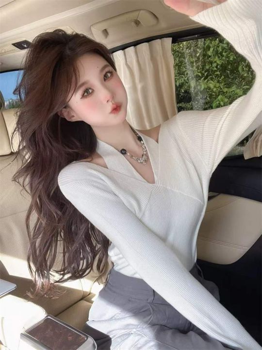 春季新款净版纯欲V领挂脖假两件冰丝顺滑曲珠长袖针织...