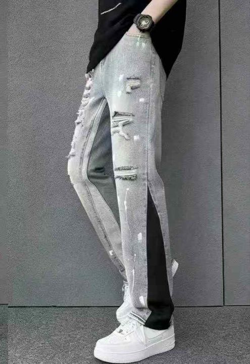 春夏季新款男美潮高街复古泼墨涂鸦直筒微喇叭牛仔裤,...