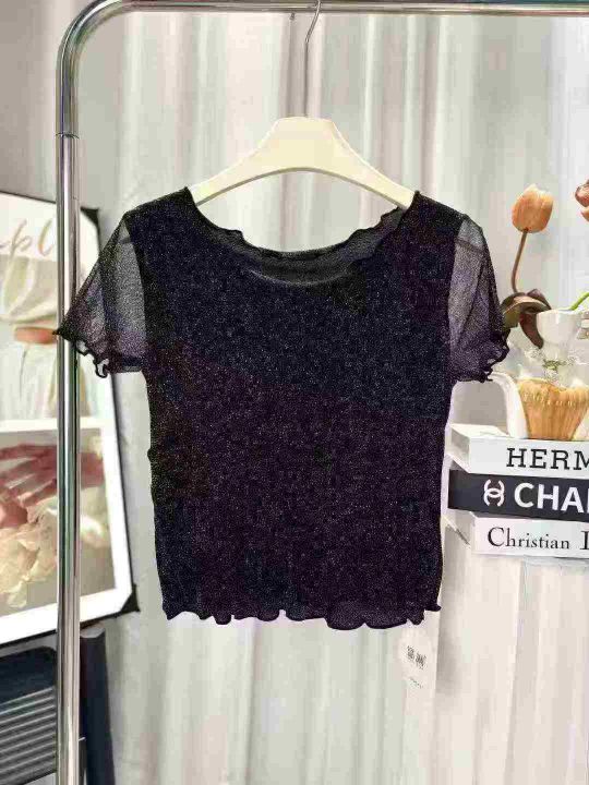 285件短款木耳边网纱打底衫女短袖内搭纱衣圆领新款亮...