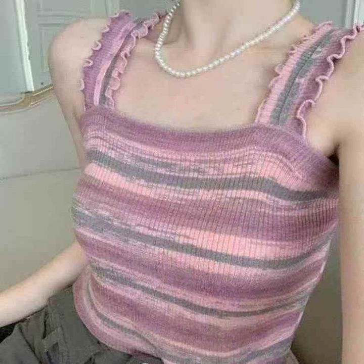 1478件针织吊带背心,条纹木耳边设计,一款7色,超弹力,穿着舒服,修身显...