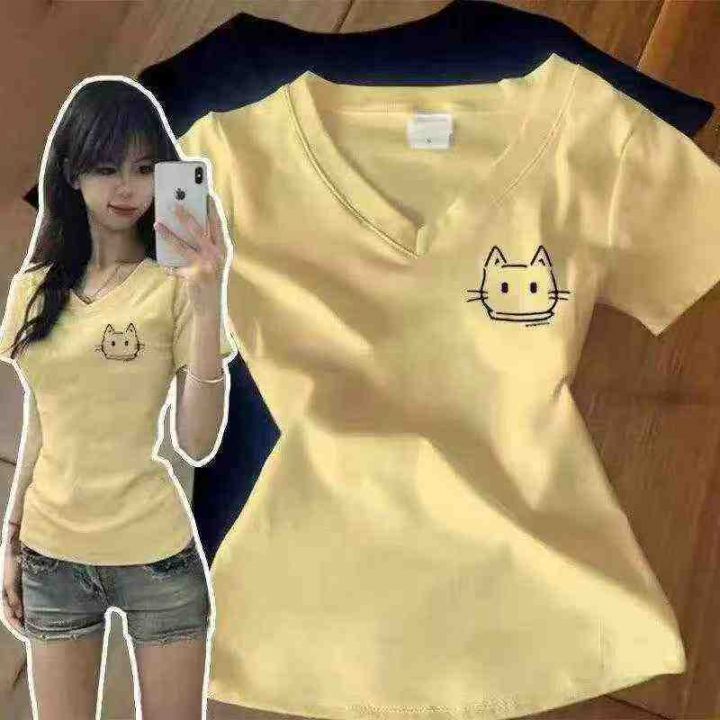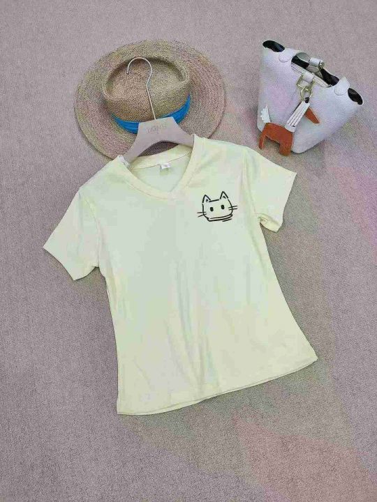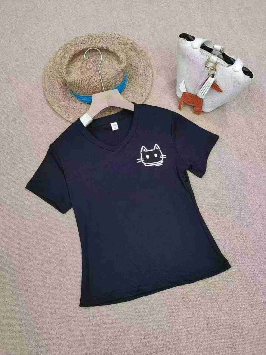 [月亮]:夏季正肩V领猫咪印花短袖T恤
