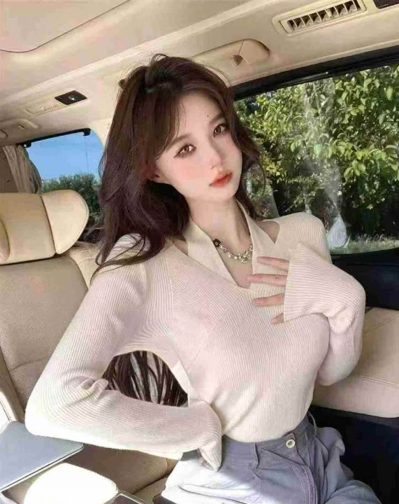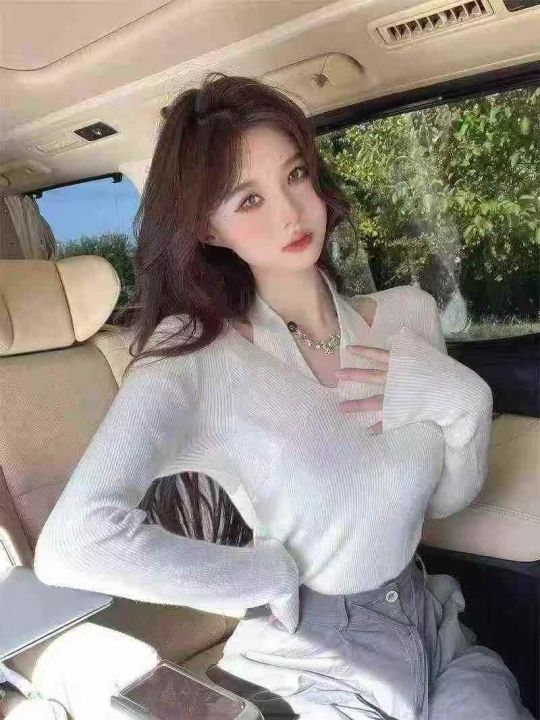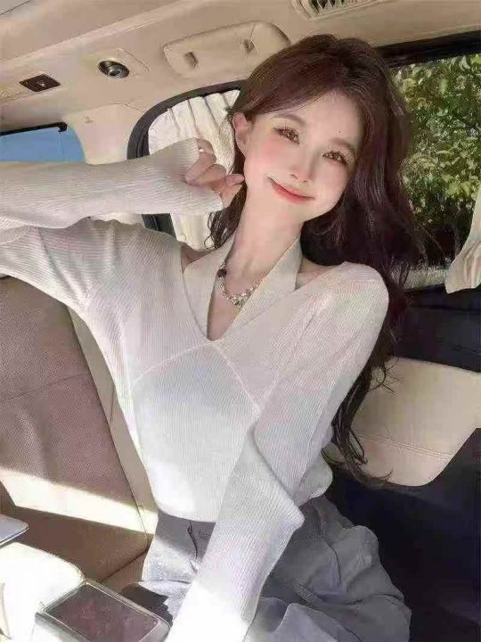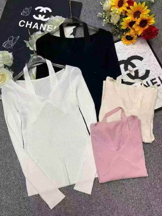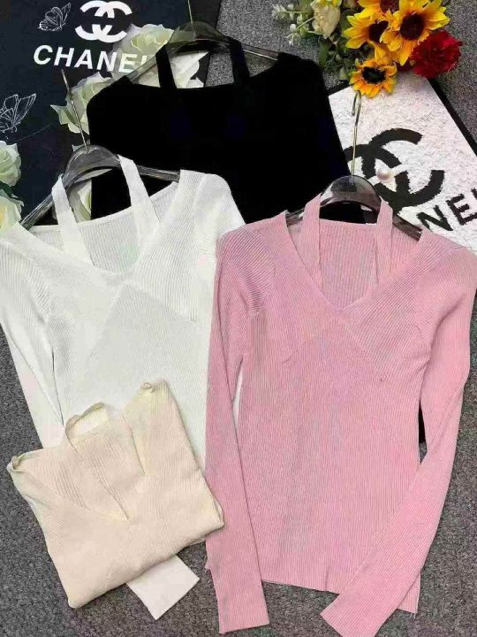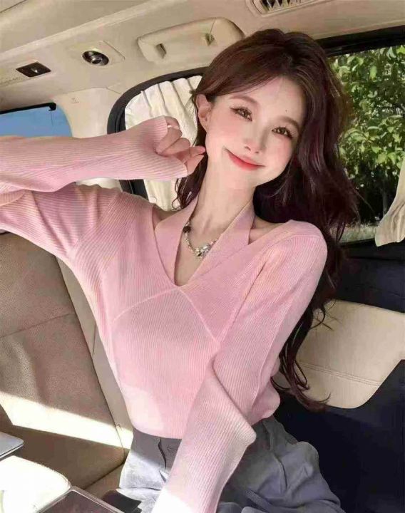 春季新款净版纯欲V领挂脖假两件冰丝顺滑曲珠长袖针织...