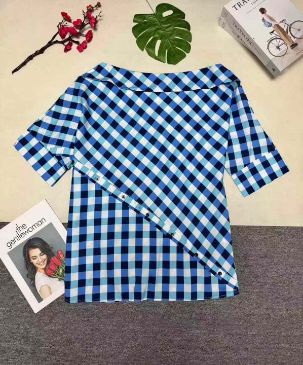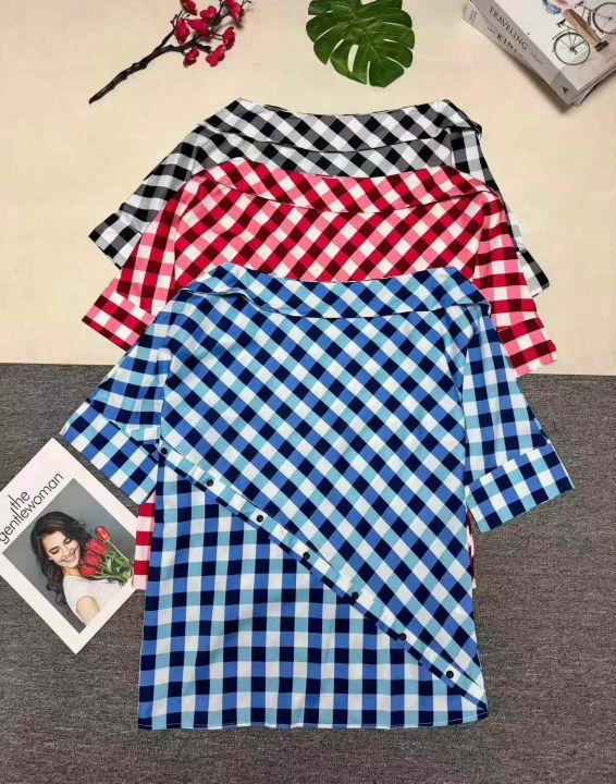 欧美女装秋冬衬衫时尚个性露肩多色格子印花不规则上衣 ,整款三色,数量:407件,码数:S至2X L,品质好,拉链式独立包装。