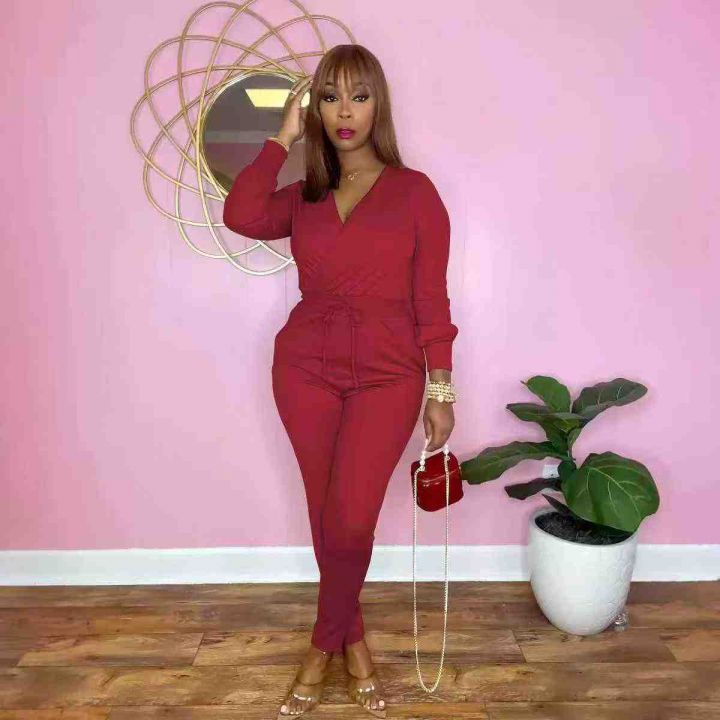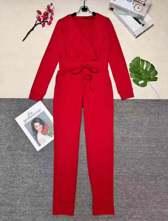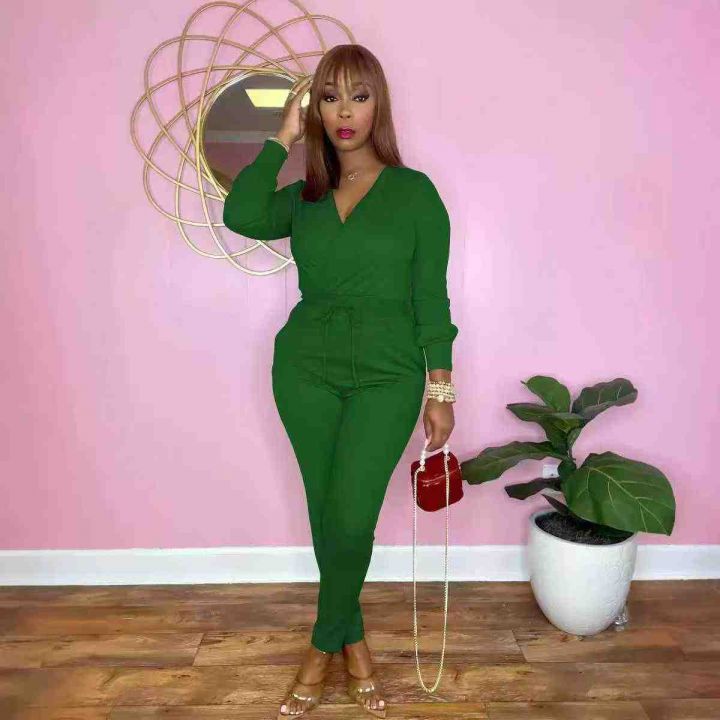欧美时尚女装纯色V领抽绳时尚秋冬连体衣,整款三色,数量:432件,码数:S-2XL,品质好,拉链式独立包装。
