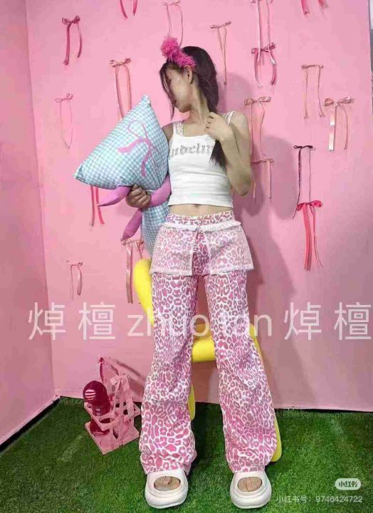 甜酷辣妹豹纹蕾丝拼接百搭牛仔裤,[爱心]240件左右,码数S-L,M码腰围72裤长114,单款两个色,穿70-130斤,广州十三行货,原包装️无瑕疵,[666]实体店品质,分货加一