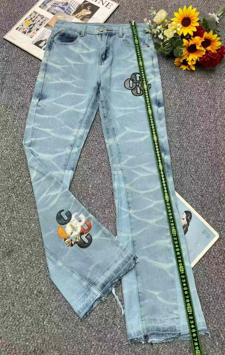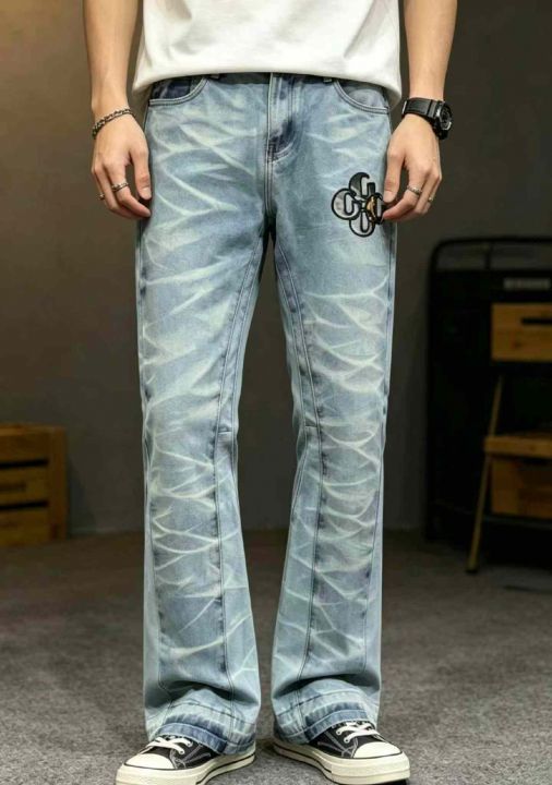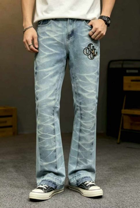 春季新款男士网红潮牌设计款刺绣微喇叭直筒牛仔裤,码...