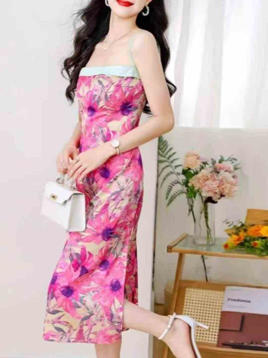法式复古碎花拼接吊带连衣裙女士夏季新款气质修身高端包臀长裙477件,独立...