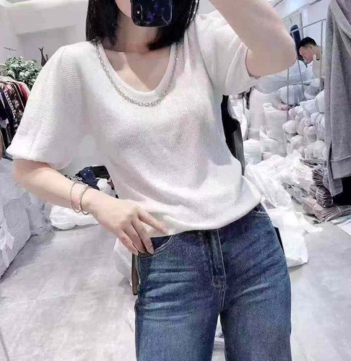 夏季新款设计师原创链条设计款泡泡袖针织冰丝短袖,独立包装,均码面料柔软...
