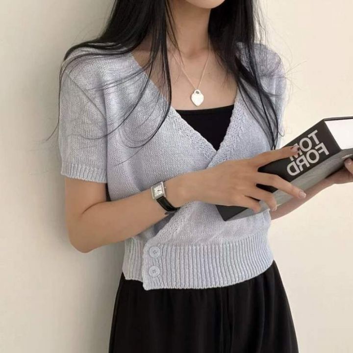夏季新款法式小众设计感斜襟V领气质两粒扣收腰针织短袖T桖,独立包装,均码面料柔软舒适有弹力,538件,全清4.9元超低价秒杀!分货加一!