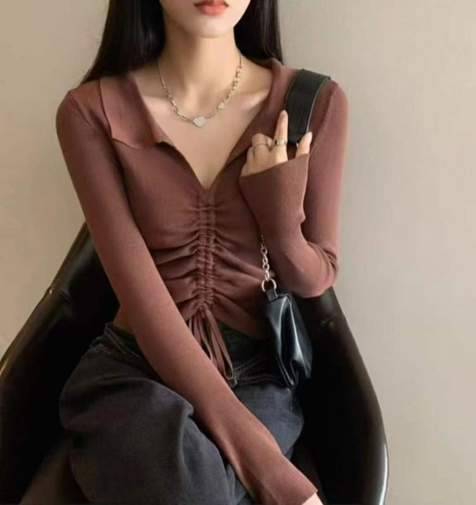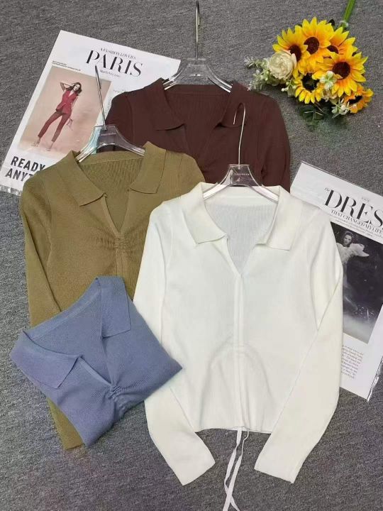 秋季新款韩版复古网红抽绳绑带设计款Polo领长袖针织套...