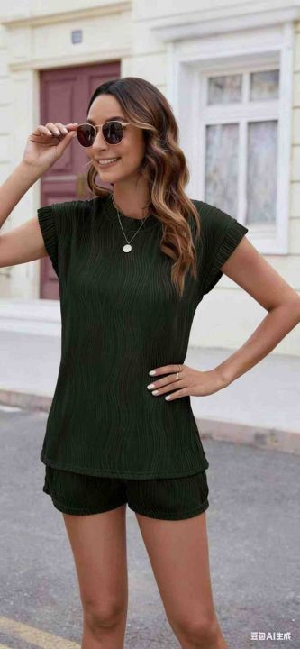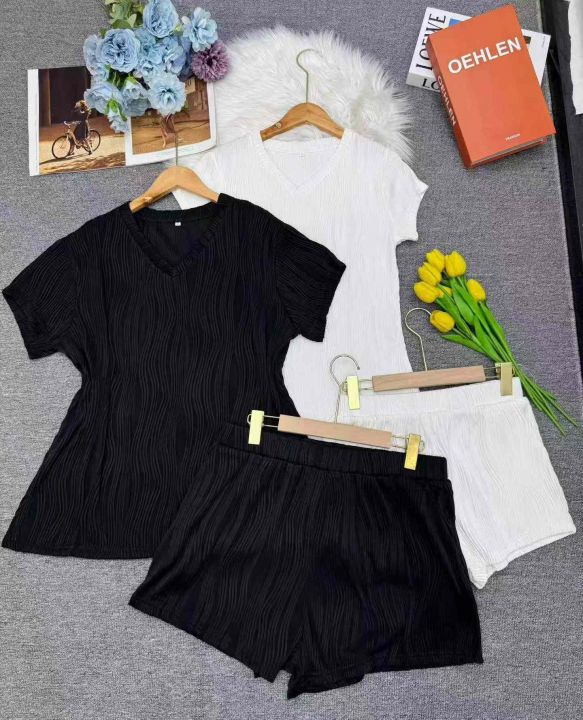 V领女夏季肌理感 短袖短裤两件套装 宽松百搭潮 独立包装,码数S-XL码,数量126套(货号406#12)