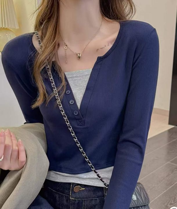 春季新款韩版正肩假两件V领修身显瘦设计感长袖上衣,...