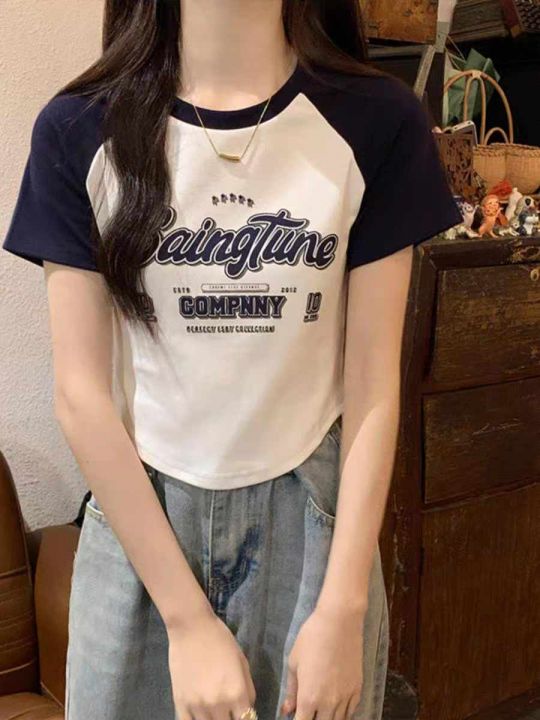 夏季新款美式撞色插肩复古印花针织短袖T桖,独立包装...