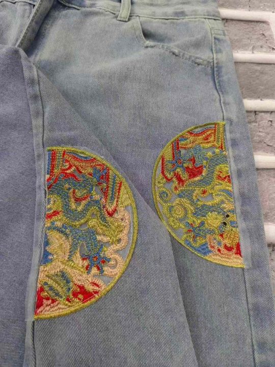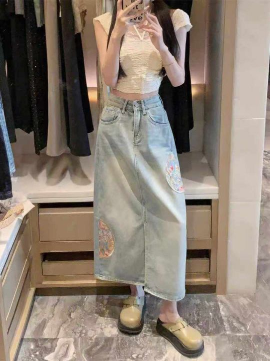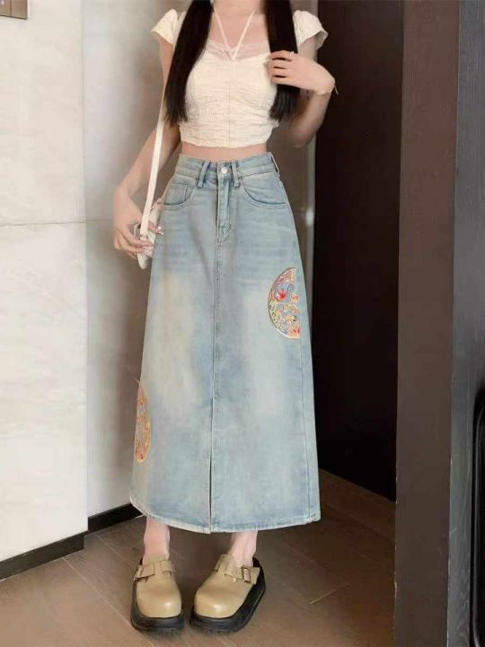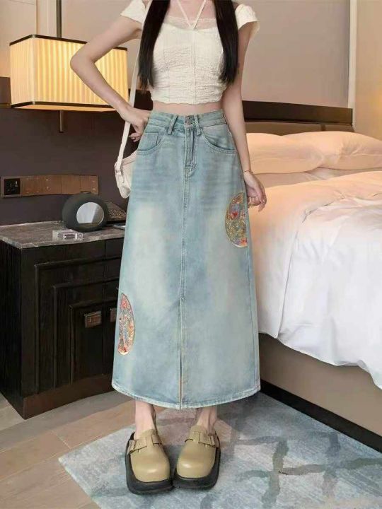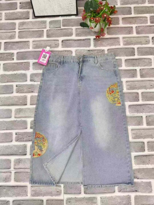 新款蓝色国风女大码中长款开叉刺绣牛仔裙 数量80件左右 尺码3XL 前开叉 侧两边重工刺绣 独立包装带吊牌 货品干净整洁