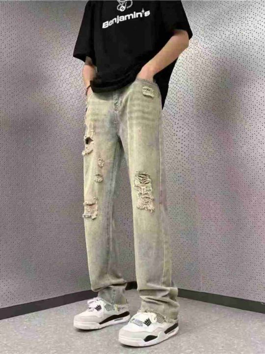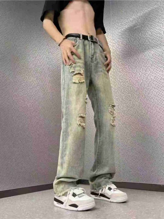 美式vibe风裤子高街潮牌黄泥染牛仔裤男复古街头阔腿长...