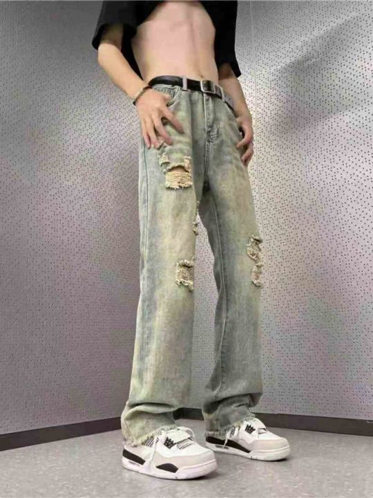 美式vibe风裤子高街潮牌黄泥染牛仔裤男复古街头阔腿长...