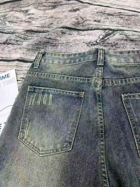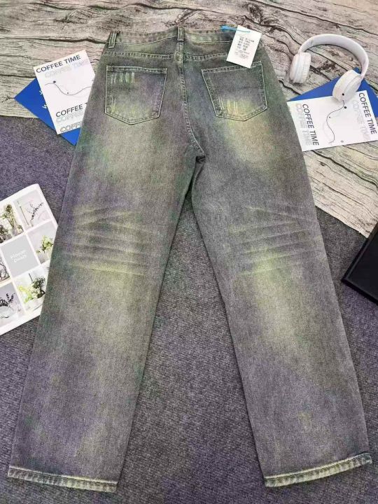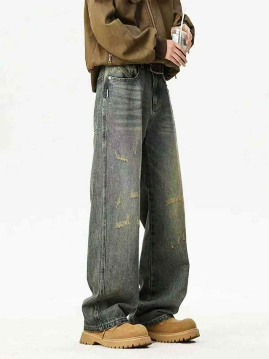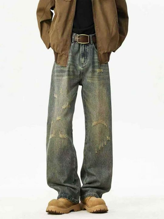 美式做旧牛仔裤男潮牌水洗刮烂直筒长裤高街休闲宽松裤...