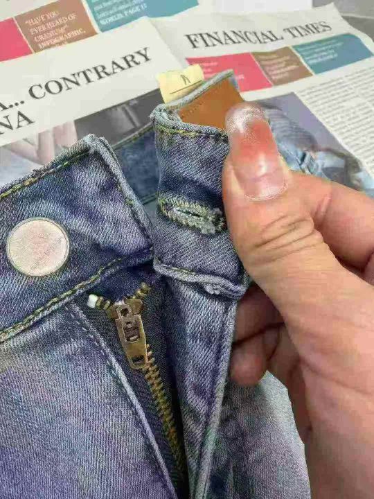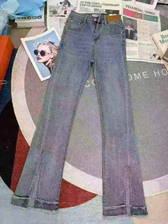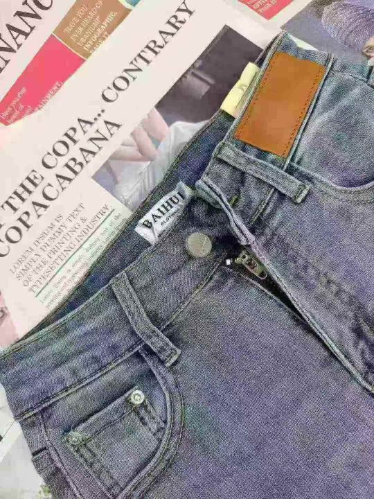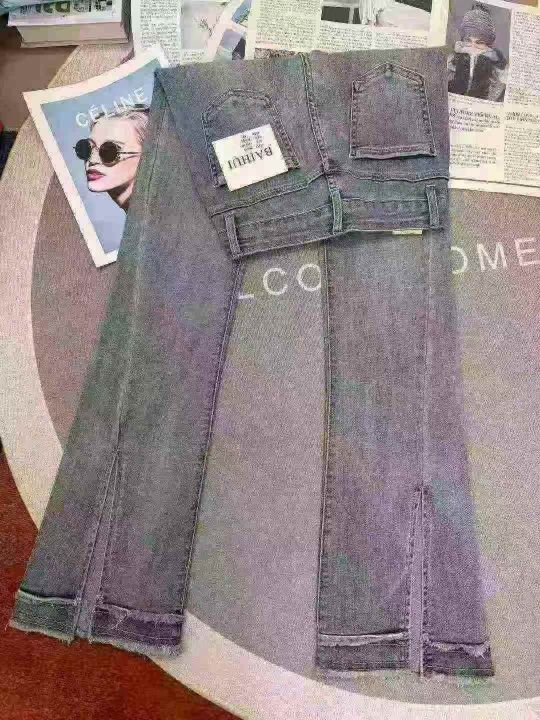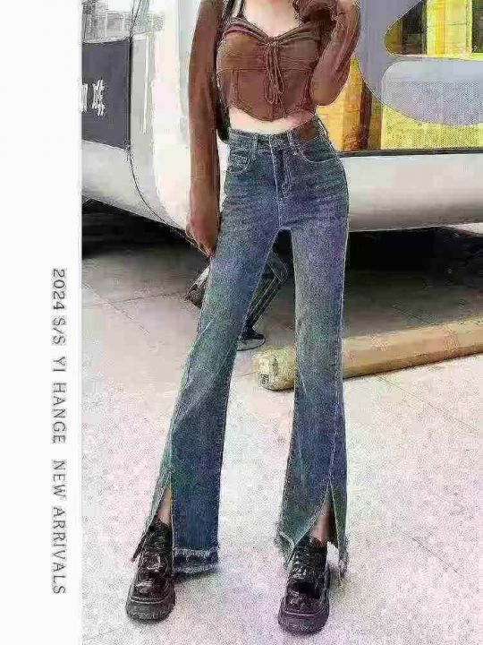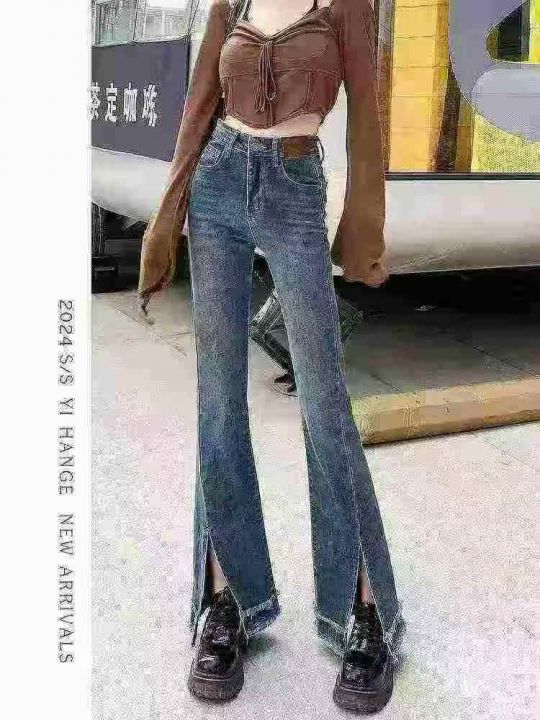 高个子高腰显瘦开叉微喇叭毛边弹力复古女士牛仔裤,单...
