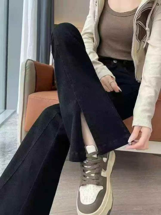 弹力黑色开叉微喇牛仔裤女新款高腰显瘦前开衩喇叭马蹄...