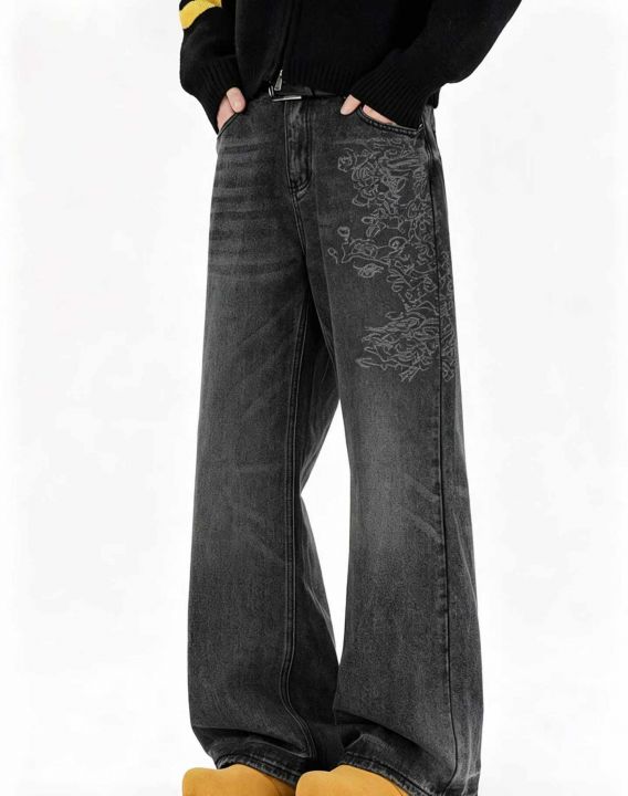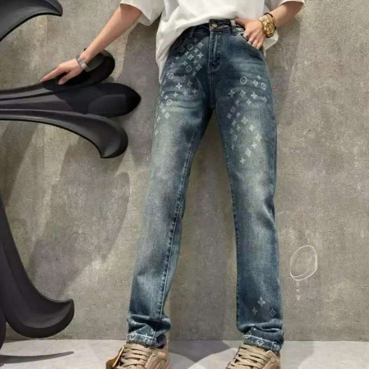 全清15.8分货+1高端美式复古提花印花小脚直筒牛仔裤男士修身欧货长裤子,独...