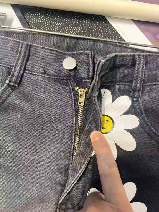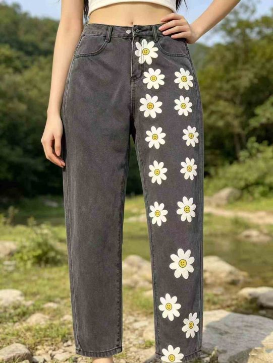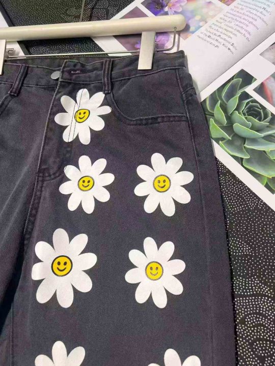 女士潮牌印花直筒牛仔裤 93件,全清12.8元,不分货,正品独立包装,货品干净,码数:S到XL,小雏菊笑脸印花炭灰色牛仔裤女 高腰直筒显瘦百搭老爹裤潮