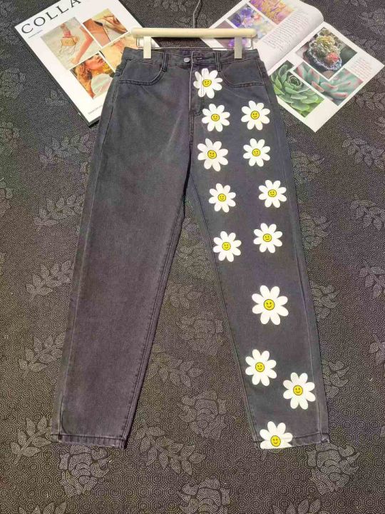 女士潮牌印花直筒牛仔裤 93件,全清12.8元,不分货,正品独立包装,货品干净,码数:S到XL,小雏菊笑脸印花炭灰色牛仔裤女 高腰直筒显瘦百搭老爹裤潮