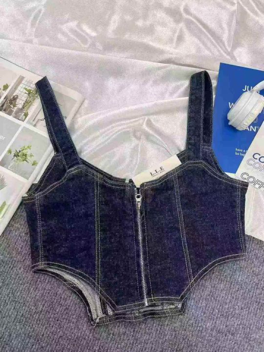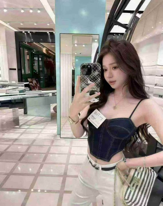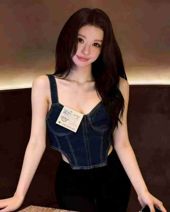 美式复古牛仔吊带抹胸个性辣妹修身显瘦上衣490件全清8...