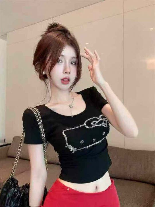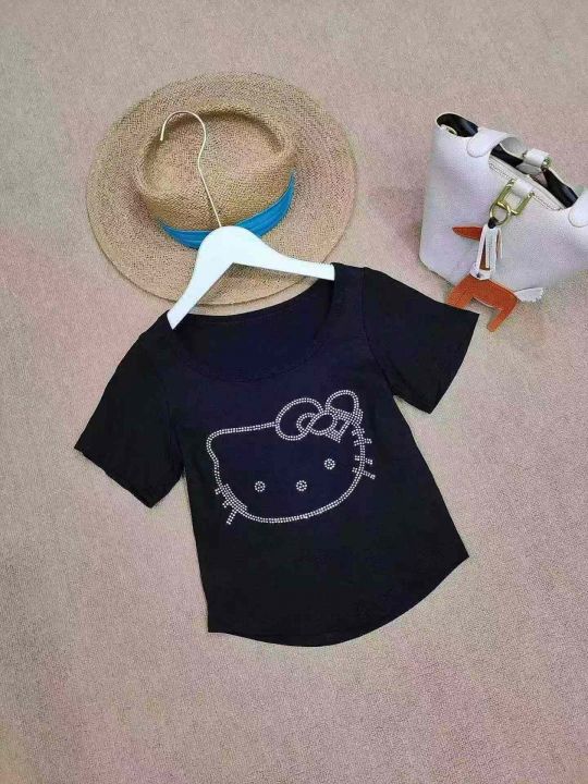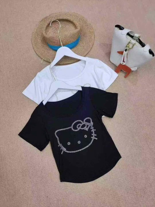 [月亮]:猫咪烫钻洋气短款气质辣妹棉T恤