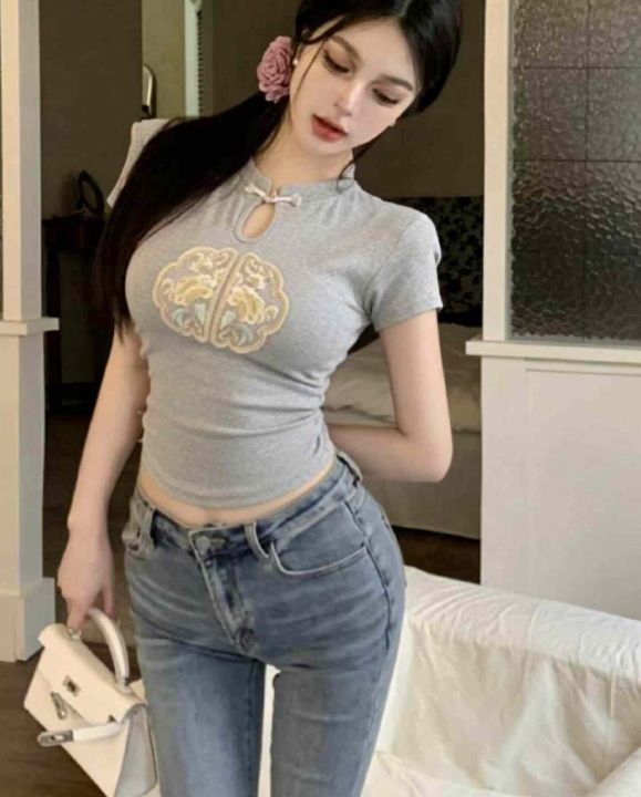 夏季新款复古新中式盘扣国风刺绣设计感百搭针织小衫,...